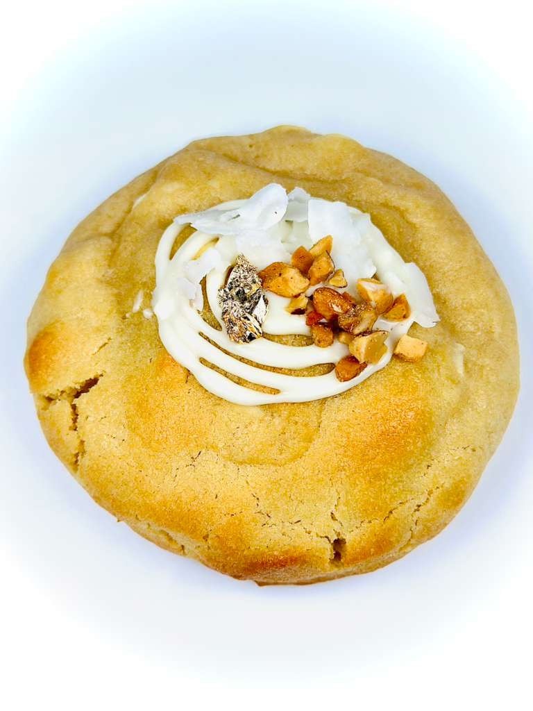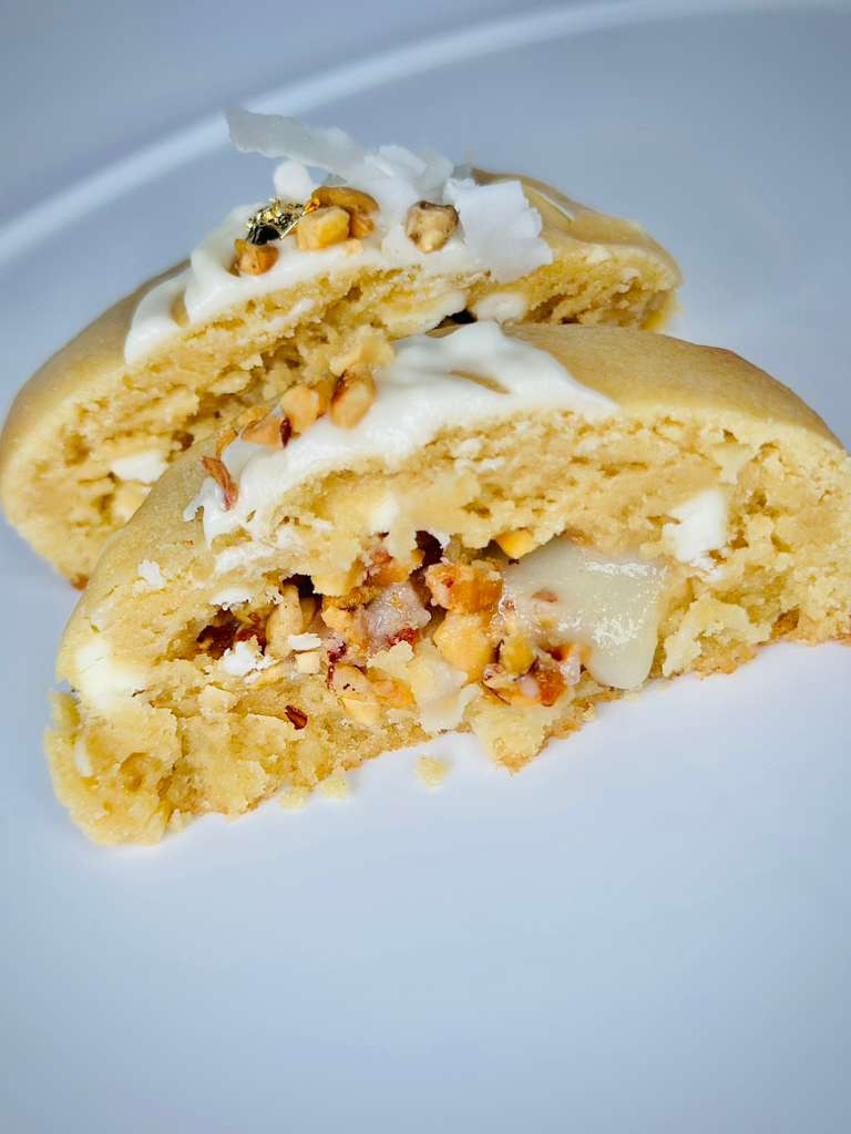 Inspired by the iconic Raffaello coconut chocolate, this soft coconut cookie is filled with a luscious white chocolate and coconut center. Delicate, creamy, and perfectly tropical, it melts in your mouth and delivers pure coconut bliss in every bite.